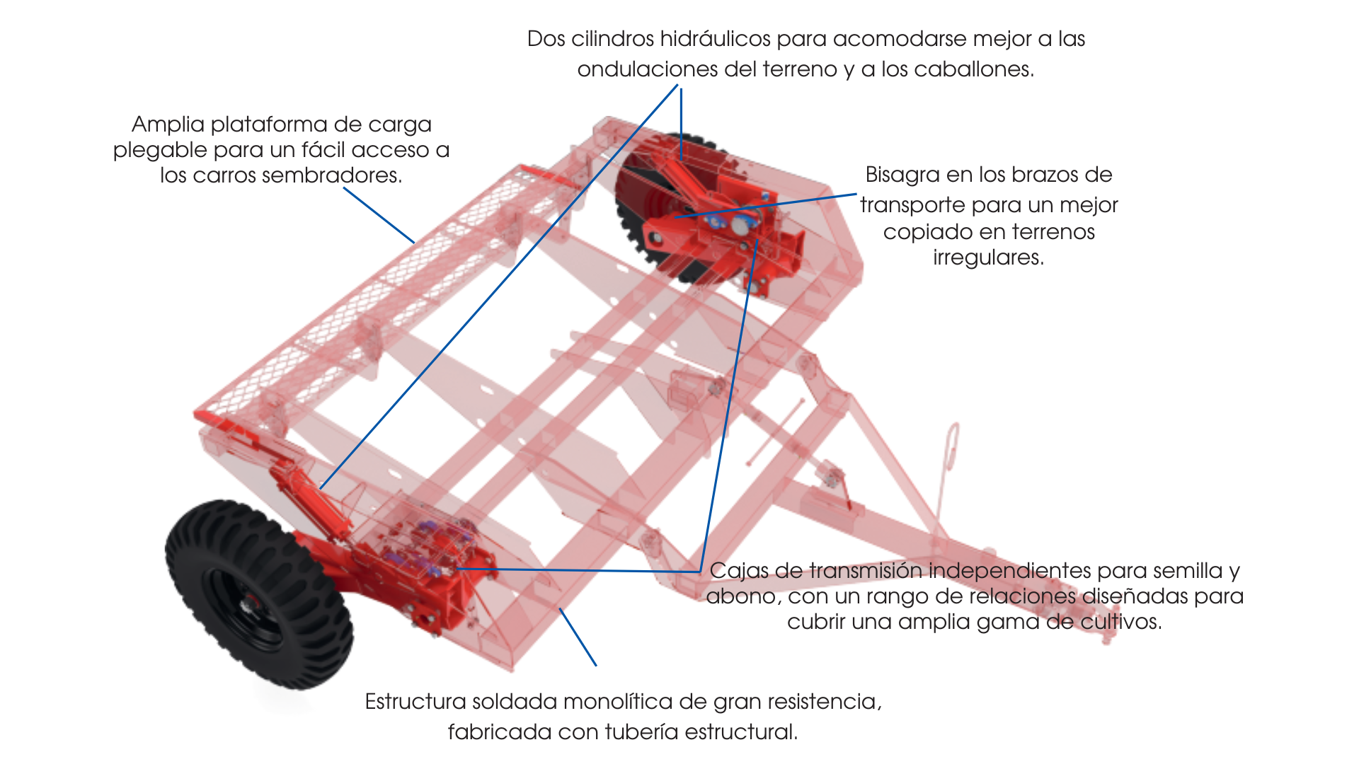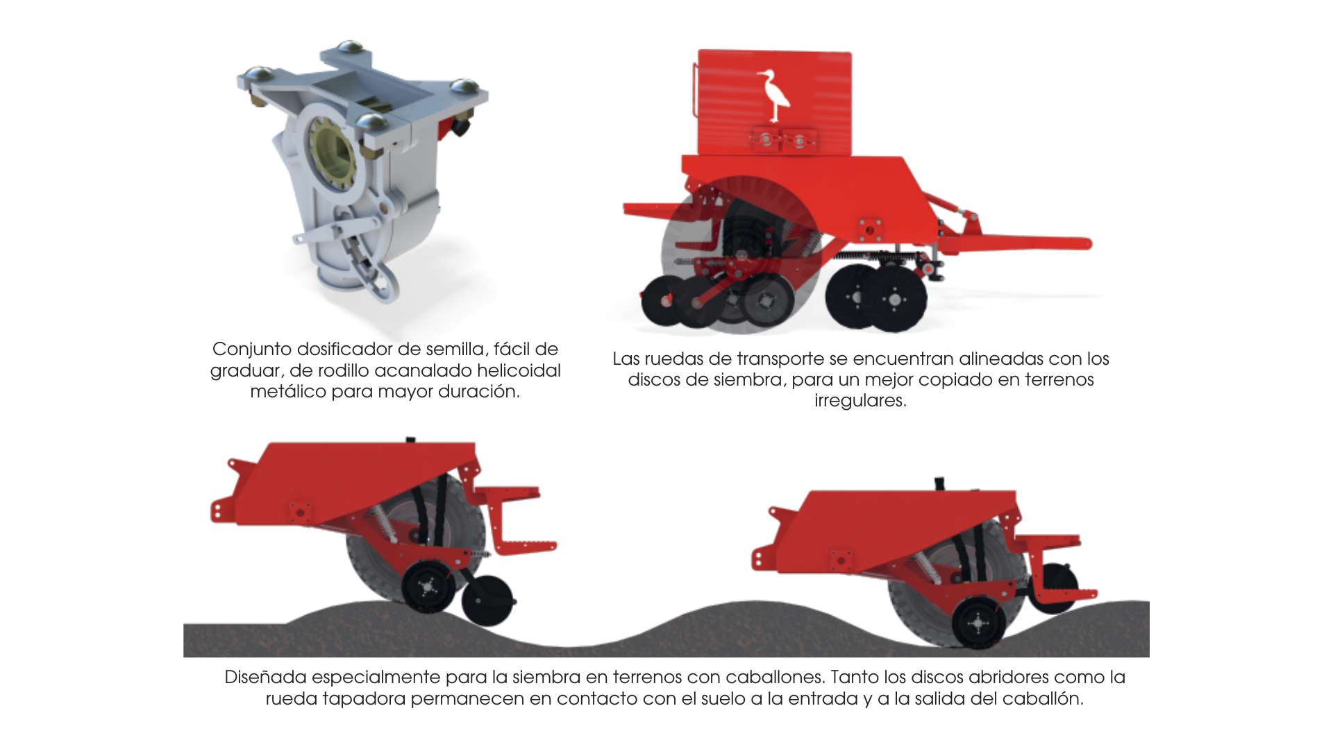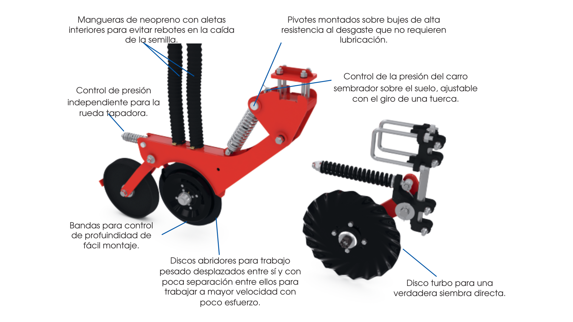 Este equipo cuenta con un sistema versátil que permite ajustar la presión de los discos abridores y ruedas tapadoras de manera independiente. Además, incorpora bandas de control de profundidad y suspensión de filas, facilitando la adaptación a distintos cultivos y distancias entre surcos. Su diseño ofrece comodidad al operador y seguridad en todo momento.
